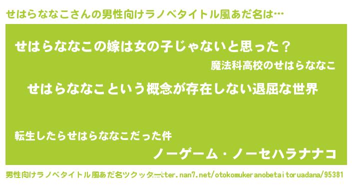 | 女子向けラノベタイトル風あだ名 | 『異世界で失敗しない100のせはらななこ』 |