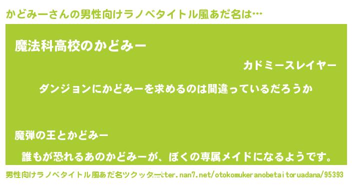 | 女子向けラノベタイトル風あだ名 | 『かどみーの卵を拾いまして』 |