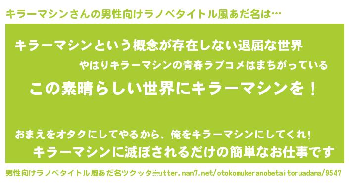 | 女子向けラノベタイトル風あだ名 | 『悪役キラーマシンに転生したようですが、知った事ではありません』 |