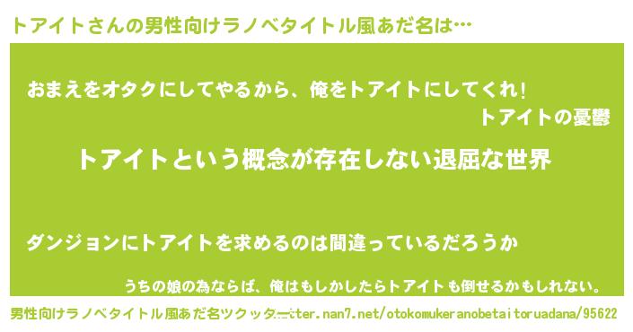 | ヘコむあだ名 | 『トアイト(小並感)』『なまこ酢』 |