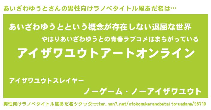 | 胡散臭い通販商品みたいなあだ名 | 『億万長者になれる霊験あらたかなお札…その名も「あいざわゆうと」』 |