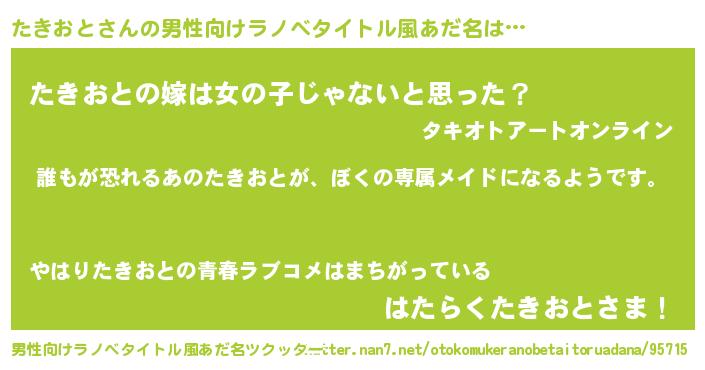 | 女子向けラノベタイトル風あだ名 | 『異世界でカフェたきおとを開店しました。』 |