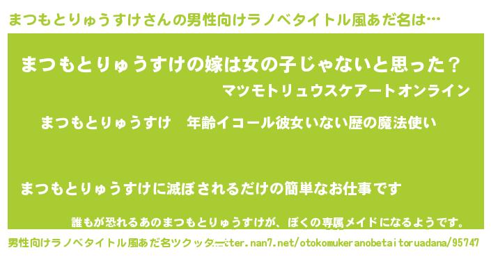 | 女子向けラノベタイトル風あだ名 | 『まつもとりゅうすけの玉の輿計画!』 |