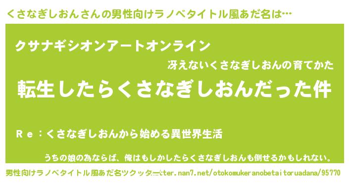 | 女子向けラノベタイトル風あだ名 | 『くさなぎしおんの玉の輿計画!』 |