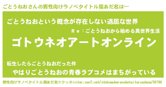 | 女子向けラノベタイトル風あだ名 | 『誰かこのごとうねおを説明してください! ~契約から始まるウェディング~』 |