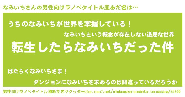 | 女子向けラノベタイトル風あだ名 | 『なみいちの玉の輿計画!』 |