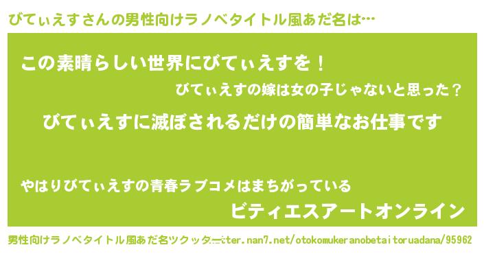 | 胡散臭い通販商品みたいなあだ名 | 『あなたにだけ特別に提供する100年もののヴィンテージワイン…その名も「びてぃえす」』 |