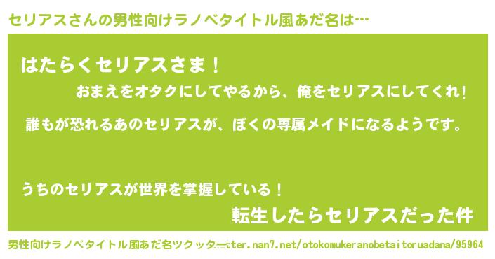 | 胡散臭い通販商品みたいなあだ名 | 『来世でも幸せになれる健康食品…その名も「セリアス」』 |