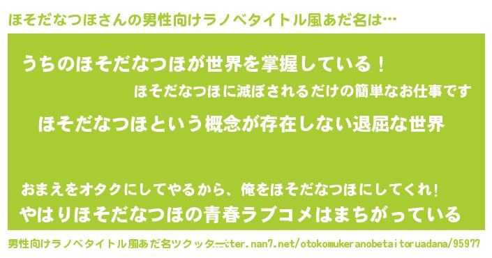 | 女子向けラノベタイトル風あだ名 | 『異世界で失敗しない100のほそだなつほ』 |