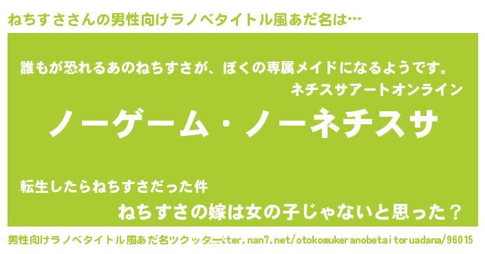 | 女子向けラノベタイトル風あだ名 | 『死神ねちすさの再婚』 |
