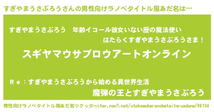| 女子向けラノベタイトル風あだ名 | 『誰かこのすぎやまうさぶろうを説明してください! ~契約から始まるウェディング~』 |