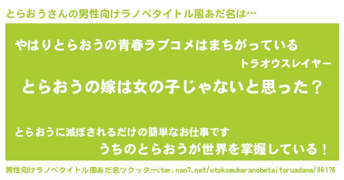 | 女子向けラノベタイトル風あだ名 | 『とらおうの卵を拾いまして』 |