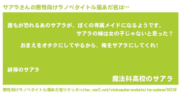 | 女子向けラノベタイトル風あだ名 | 『サアラ恋絵巻』『サアラの契約王妃』 |