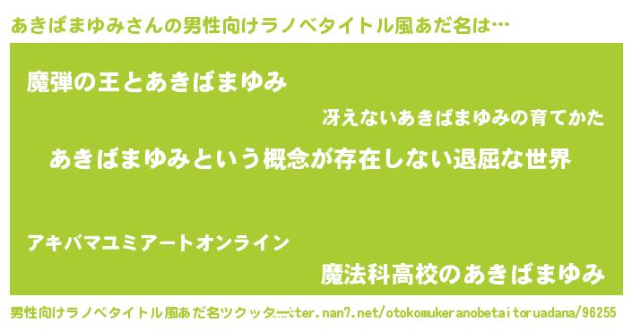 | 女子向けラノベタイトル風あだ名 | 『異世界で失敗しない100のあきばまゆみ』 |