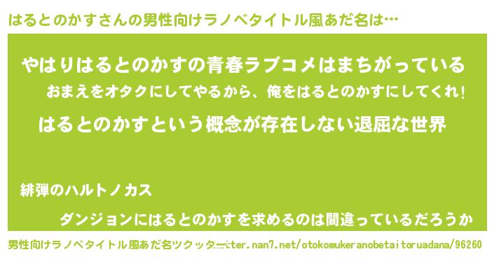 | 女子向けラノベタイトル風あだ名 | 『異世界で失敗しない100のはるとのかす』 |