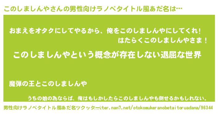 | 胡散臭い通販商品みたいなあだ名 | 『絶対に幸福をもたらす健康食品…その名も「このしましんや」』 |
