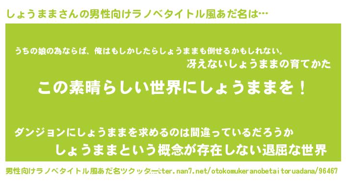 | 胡散臭い通販商品みたいなあだ名 | 『あなたにだけ特別に提供する限定10本のレアな日本酒…その名も「しょうまま」』 |