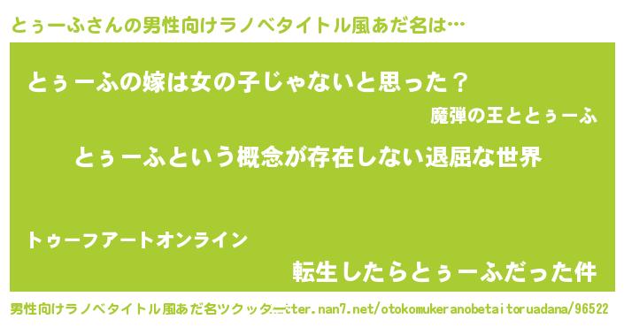 | 女子向けラノベタイトル風あだ名 | 『異世界で失敗しない100のとぅーふ』 |