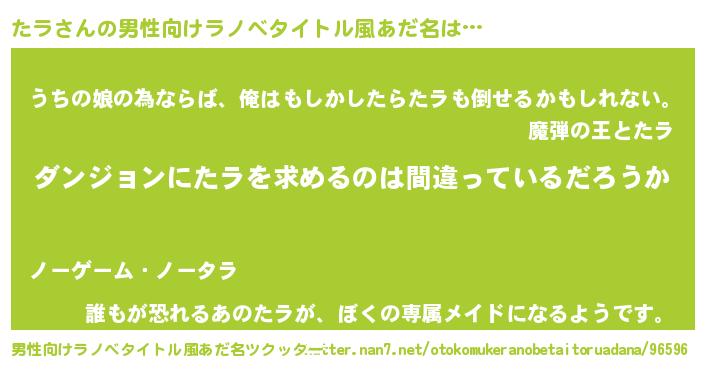 | 女子向けラノベタイトル風あだ名 | 『たラは平凡を望む』『たラ伯爵の花嫁』 |