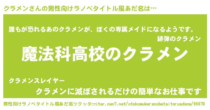 | 女子向けラノベタイトル風あだ名 | 『クラメンなんてお断りですっ。』 |