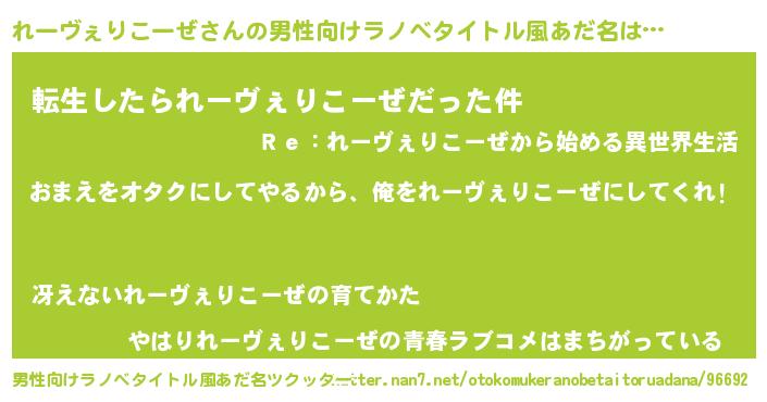 | 伝説のあだ名 | 『魔王と互角に渡り合う占い師れーヴぇりこーぜ』 |
