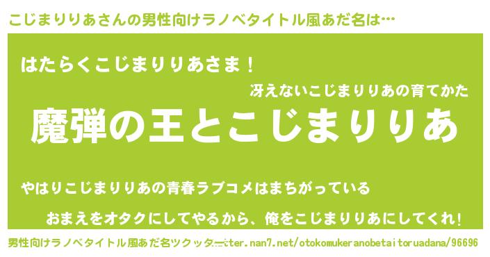| 女子向けラノベタイトル風あだ名 | 『乙女ゲームの破滅フラグしかない悪役こじまりりあに転生してしまった…』 |