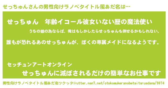 | 女子向けラノベタイトル風あだ名 | 『異世界でカフェせっちゅんを開店しました。』 |