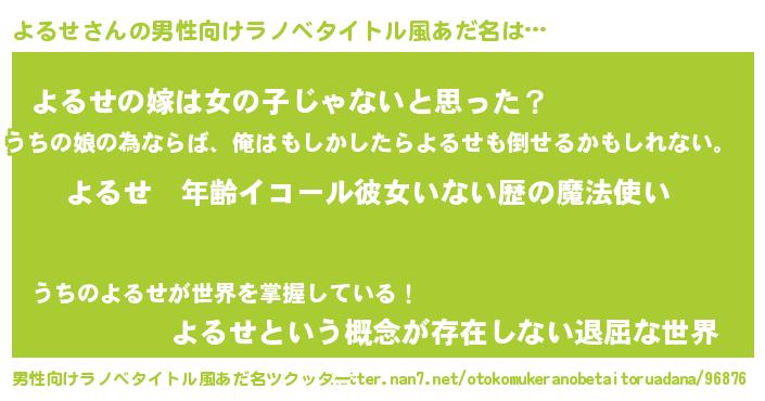 | 女子向けラノベタイトル風あだ名 | 『よるせの玉の輿計画!』 |