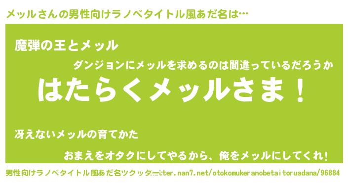 | 女子向けラノベタイトル風あだ名 | 『首の姫と首なしメッル』『メッル恋絵巻』 |