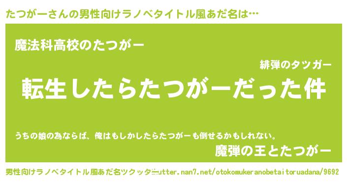 | 意味不明あだ名 | 『たけのこ科たつがー属』『自称たつがー』 |