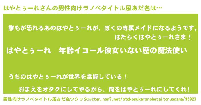| 女子向けラノベタイトル風あだ名 | 『はやとぅーれの玉の輿計画!』 |