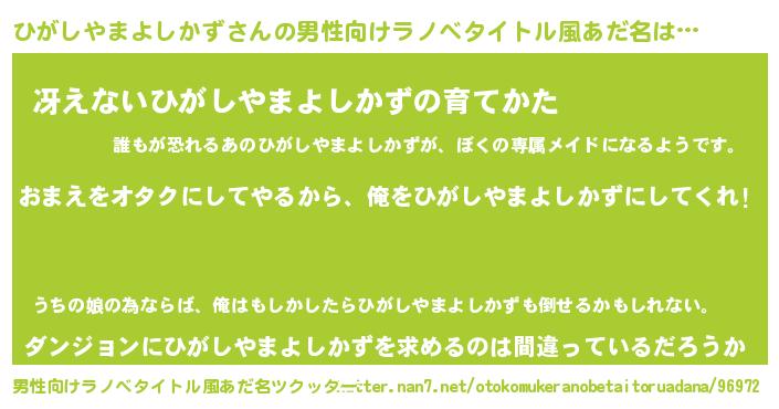 | 女子向けラノベタイトル風あだ名 | 『ひがしやまよしかず夫妻のなれそめ』 |