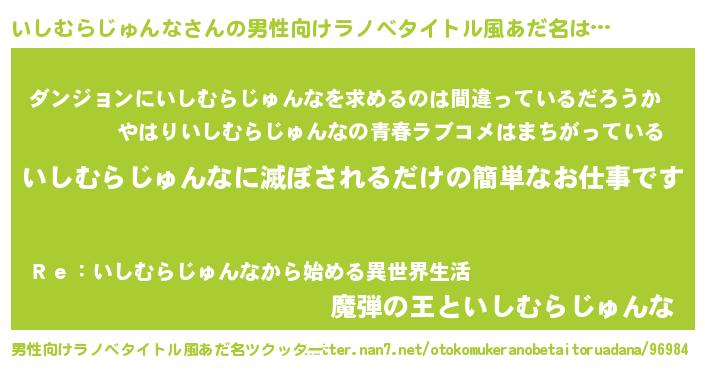 | 女子向けラノベタイトル風あだ名 | 『横柄いしむらじゅんなと宰相陛下』 |