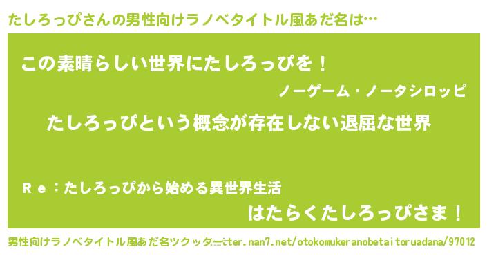 | 胡散臭い通販商品みたいなあだ名 | 『絶対に幸福をもたらす水素水…その名も「たしろっぴ」』 |