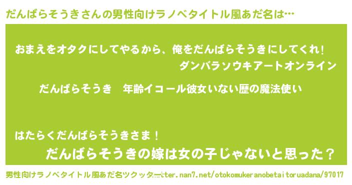 | 女子向けラノベタイトル風あだ名 | 『だんばらそうきの玉の輿計画!』 |