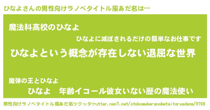 | 女子向けラノベタイトル風あだ名 | 『異世界で失敗しない100のひなよ』 |