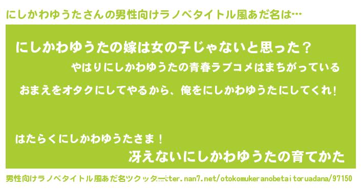 | 女子向けラノベタイトル風あだ名 | 『にしかわゆうた夫妻のなれそめ』 |