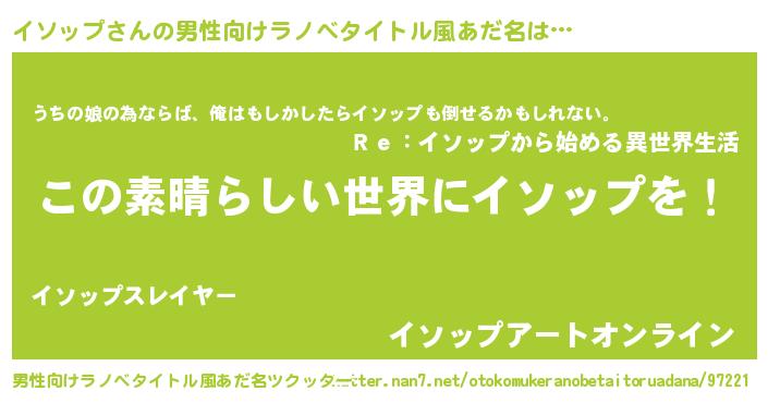 | 女子向けラノベタイトル風あだ名 | 『乙女ゲームの破滅フラグしかない悪役イソップに転生してしまった…』 |