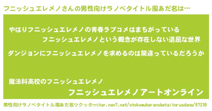 | 女子向けラノベタイトル風あだ名 | 『フニッシュエレメノは平凡を望む』 |