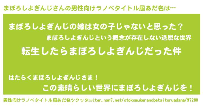 | 女子向けラノベタイトル風あだ名 | 『まぼろしよぎんじの玉の輿計画!』 |