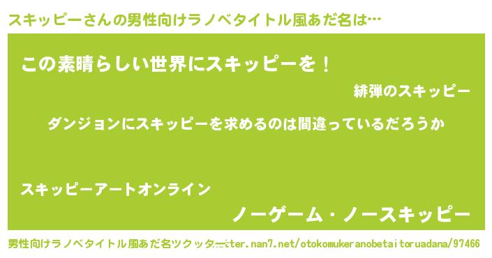 | 胡散臭い通販商品みたいなあだ名 | 『信頼と実績のサプリメント…その名も「スキッピー」』 |