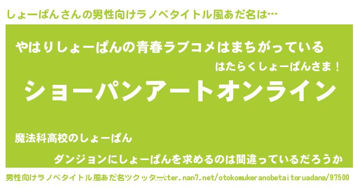 | 女子向けラノベタイトル風あだ名 | 『しょーぱん姫と円卓の騎士』 |