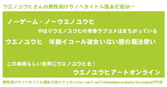 | 女子向けラノベタイトル風あだ名 | 『ウエノユウヒの玉の輿計画!』 |
