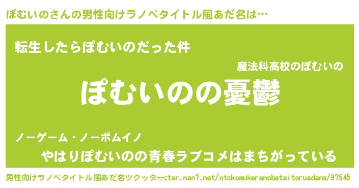 | 女子向けラノベタイトル風あだ名 | 『(仮)ぽむいののやんごとなき事情』 |
