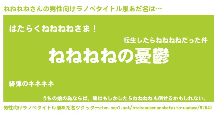 | 女子向けラノベタイトル風あだ名 | 『(仮)ねねねねのやんごとなき事情』 |