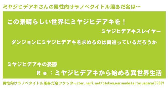 | 女子向けラノベタイトル風あだ名 | 『ミヤジヒデアキは平凡を望む』 |