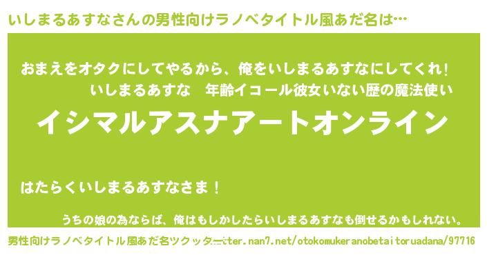| 女子向けラノベタイトル風あだ名 | 『誰かこのいしまるあすなを説明してください! ~契約から始まるウェディング~』 |