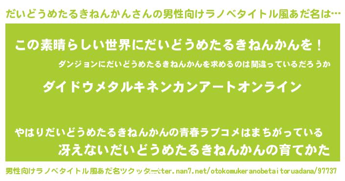 | 女子向けラノベタイトル風あだ名 | 『誰かこのだいどうめたるきねんかんを説明してください! ~契約から始まるウェディング~』 |