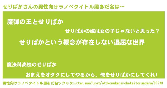 | 女子向けラノベタイトル風あだ名 | 『異世界で失敗しない100のせりぱか』 |