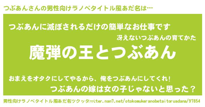 | 女子向けラノベタイトル風あだ名 | 『乙女ゲームの破滅フラグしかない悪役つぶあんに転生してしまった…』 |